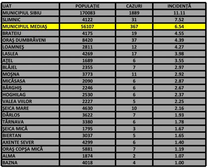 Rata de incidență cumulată în UAT-urile din zona Mediaș și municipiul Sibiu este următoarea: