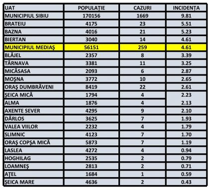 Rata de incidență cumulată în UAT-urile din zona Mediaș și municipiul Sibiu este următoarea: