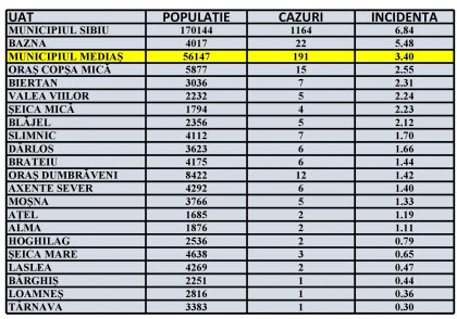 Rata de incidență cumulată în UAT-urile din zona Mediaș și municipiul Sibiu este următoarea: