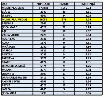 Rata de incidență cumulată în UAT-urile din zona Mediaș și municipiul Sibiu este următoarea: