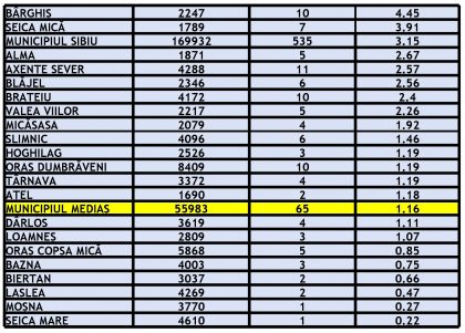 Rata incidenței este de 1,16 cu 65 cazuri active în ultimele 14 zile la Mediaș, față de 1,45 în ziua anterioară. La nivelul județului Sibiu, rata de incidență cumulată este de 2,47 față de 2,67 în ziua anterioară.