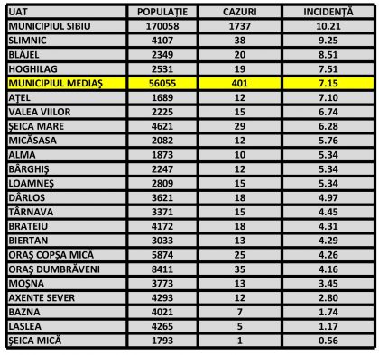 Rata de incidență cumulată în UAT-urile din zona Mediaș și municipiul Sibiu este următoarea: