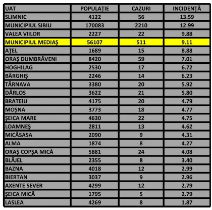 Rata de incidență cumulată în UAT-urile din zona Mediaș și municipiul Sibiu este următoarea: