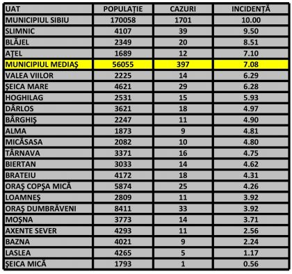 Rata de incidență cumulată în UAT-urile din zona Mediaș și municipiul Sibiu este următoarea: