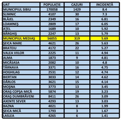Rata de incidență cumulată în UAT-urile din zona Mediaș și municipiul Sibiu este următoarea: