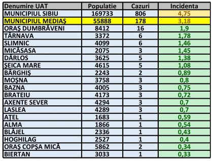 Rata de incidență cumulată în UAT-urile din zona Mediaș și municipiul Sibiu este următoarea: