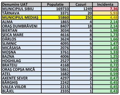 Rata de incidență cumulată în UAT-urile din zona Mediaș și municipiul Sibiu este următoarea: