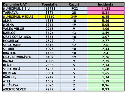 Rata de incidență cumulată în UAT-urile din zona Mediaș și municipiul Sibiu este următoarea: