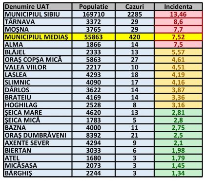 Rata de incidență cumulată în UAT-urile din zona Mediaș și municipiul Sibiu este următoarea: