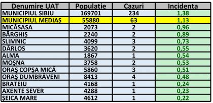Rata de incidență cumulată în UAT-urile din zona Mediaș și municipiul Sibiu este următoarea: