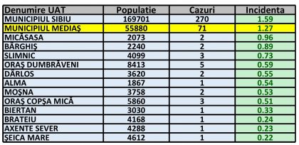 Rata incidenței este de 1,27 cu 71 cazuri active în ultimele 14 zile la Mediaș, față de 1,13 în ziua anterioară. La nivelul județului Sibiu, rata de incidență cumulată este de 1,03 față de 0,89 în ziua precedentă.