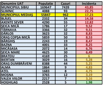 Rata de incidență cumulată în UAT-urile din zona Mediaș și municipiul Sibiu este următoarea: