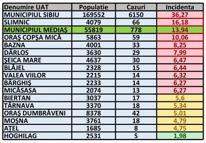 Rata de incidență cumulată în UAT-urile din zona Mediaș și municipiul Sibiu este următoarea: