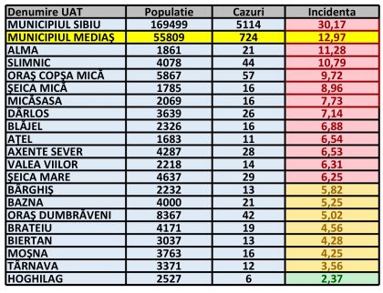 Rata incidenței este de 12,94 cu 724 cazuri active în ultimele 14 zile la Mediaș, față de 13,22 în ziua anterioară. La nivelul județului Sibiu, rata de incidență cumulată este de 18,49 față de 19,15 în ziua precedentă.
