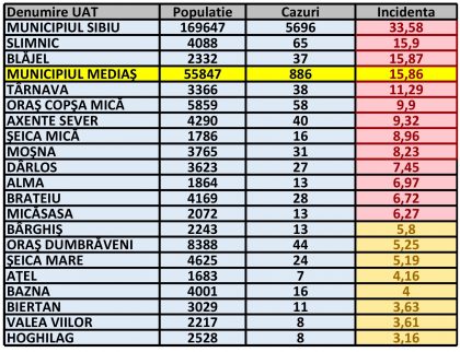 Rata de incidență cumulată în UAT-urile din zona Mediaș și municipiul Sibiu este următoarea: