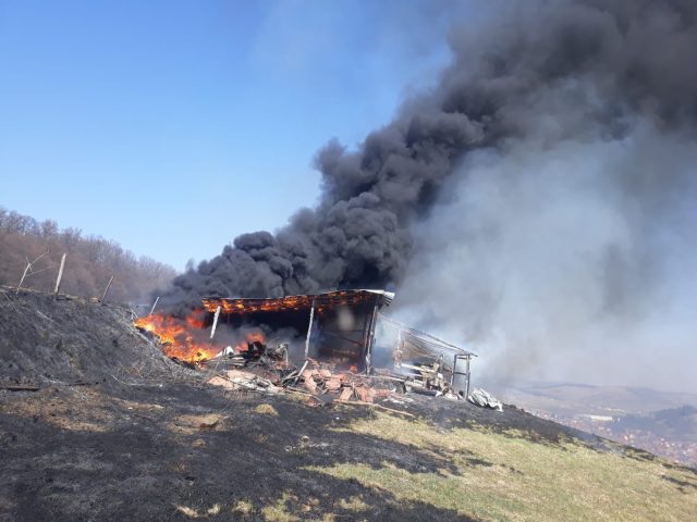 Cabană și saivan distruse în urma unor incendii de vegetație uscată.