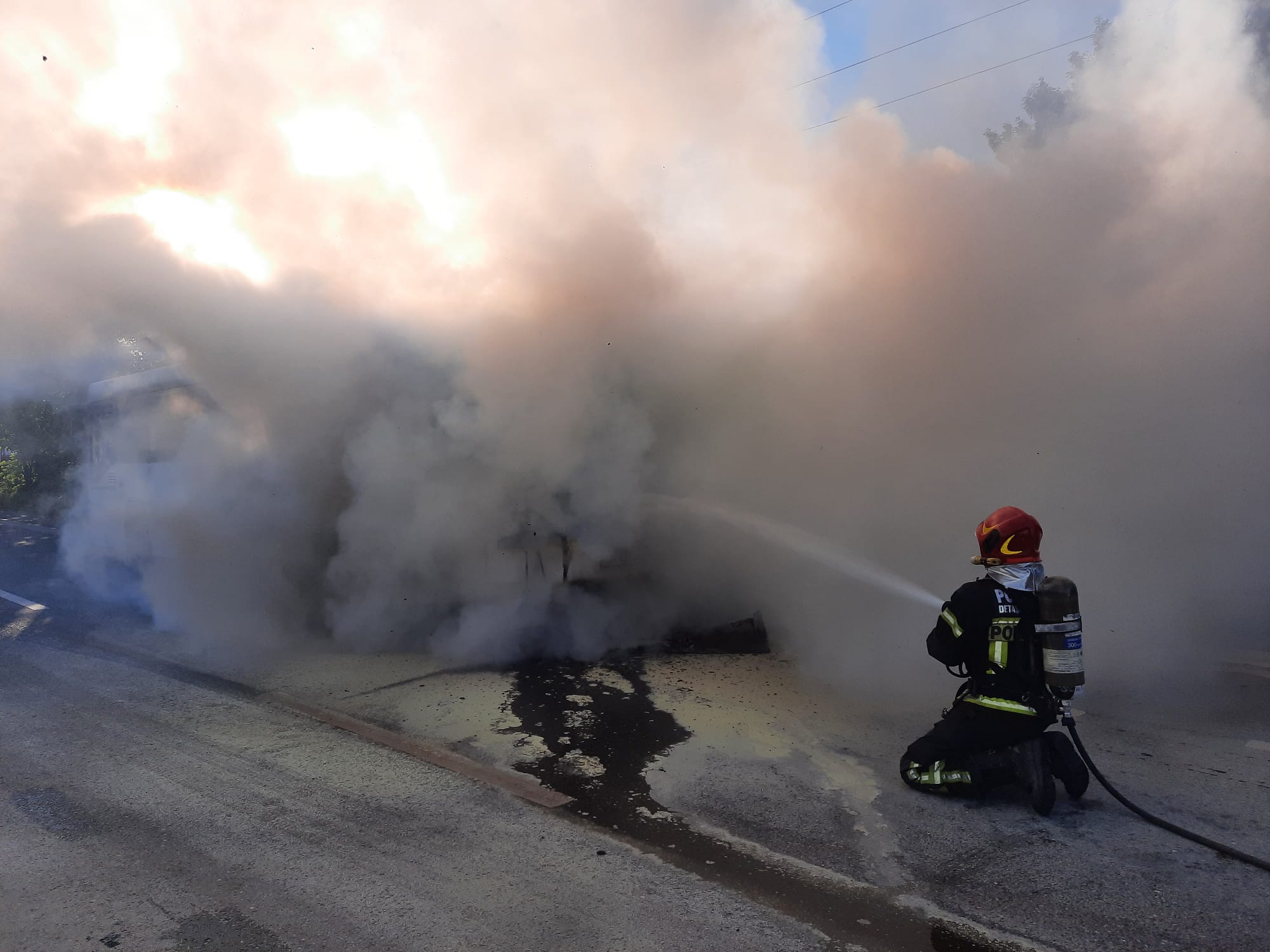 ,,ISU Sibiu a intervenit de urgență cu un echipaj de pompieri militari si un echipaj SMURD in municipiul Sibiu, strada Viile Sibiului pentru localizarea și lichidarea unui incendiu izbucnit la compartimentul motor al unui autobuz staționat fără persoane în interior.