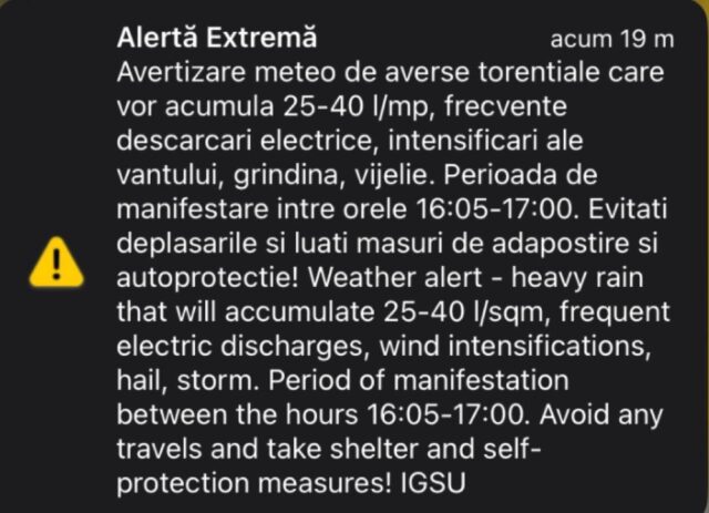 „Avertizarea meteorologică este valabilă astăzi 11 iunie 2024 între orele 16:05 – 17:00 și vizează următoarele localități din județul Sibiu: Sibiu, Săliște, Șeica Mare, Ocna Sibiului, Jina, Miercurea Sibiului, Slimnic, Gura Râului, Loamneș, Orlat, Poiana Sibiului, Cristian, Șura Mare, Păuca, Șura Mică, Tilișca, Șeica Mică, Poplaca, Apoldu de Jos, Ludoș. Pentru locuitorii din localități mai sus amintite IGSU a transmis mesaj RO-Alert.