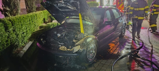 Un autoturism a luat foc la Dumbrăveni din cauza unui scurtcircuit electric la motor | Foto.