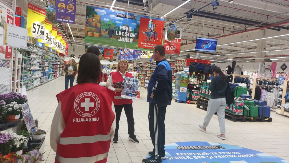 Pe parcursul întregului weekend care a trecut, voluntari și angajați ai Crucii Roșii Sibiu, alături de directorul filialei, Raluca Morar, dar și de Președintele filialei Sibiu, Mihai Balaban și de unul dintre vicepreședinții filialei, Raluca Budușan, au îndemnat sibienii să doneze alimente neperisabile și articole de igienă pentru persoanele care au fost afectate de inundații, în cadrul programului Banca de Alimente derulat la Carrefour.