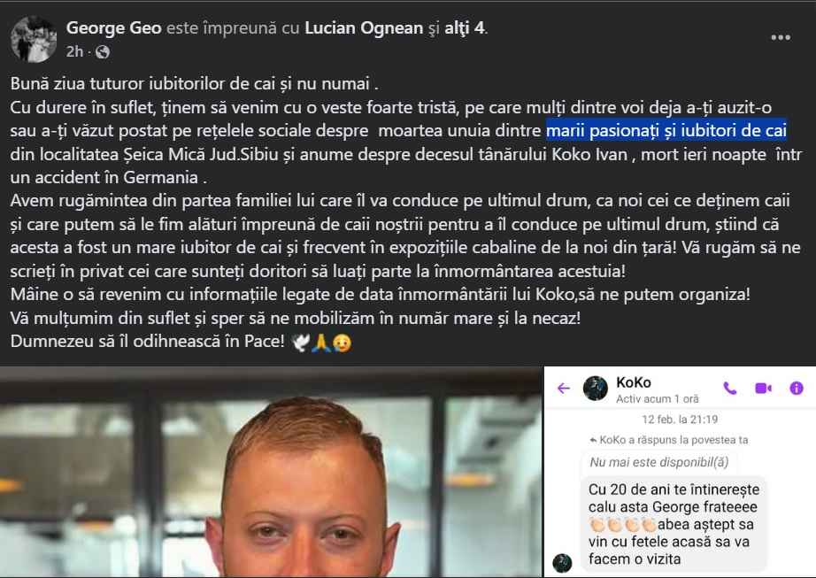 Koko Ivan era unul din marii pasionați și iubitori de cai din Șeica Mică, județul Sibiu. Prietenii îi pregătesc o mormântare cu cai și fac apel la toți cei care l-au cunoscut, să-l conducă pe ultimul drum.