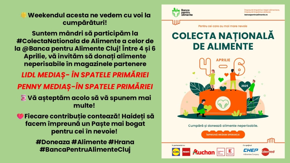 Municipiul Mediaș va găzdui la sfârșitul acestei săptămâni Colecta națională de alimente. Proiectul este derulat de către Banca pentru Alimente Cluj în parteneriat cu Școala Postliceală Auxila, la două supermarketuri din zona centrală a Mediașului.