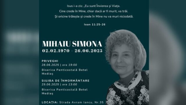 Priveghiul va avea loc în această seară de la ora 19.00 iar slujba de înmormântare va avea loc mâine, 29.06.2025, de la ora 13.00 la Biserica Penticostală Betel Mediaș de pe Str. Avram Iancu, nr. 35. Dumnezeu să o odihnească în pace! Condoleanțe familiei!” este mesajul transmis de Colegiul Școala Națională de Gaz.