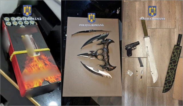 Totodată, la data de 27 august a.c., în baza unui mandat, au fost efectuate trei percheziții domiciliare în municipiul Sibiu, fiind identificate și ridicate la domiciliul bărbatului de 28 de ani următoarele: mai multe pliculețe ce conțineau un praf de culoare albă, un plic ce conținea substanță solidă de forma unor pietricele de culoare alb transparent, 23 de cartușe de 0,9 mm, destinate unei arme cu gaz, mai multe arme albe și două cântare electronice de precizie.