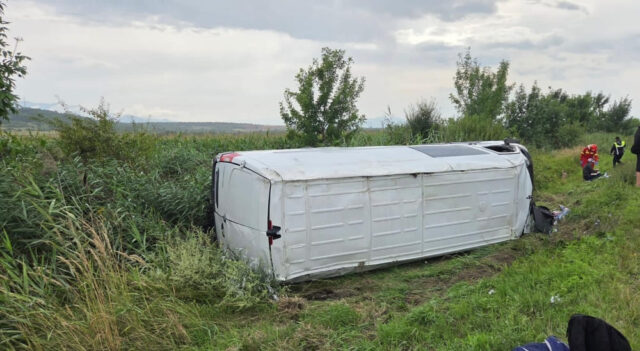 În urmă coliziunii, microbuzul, care transporta 8 persoane, s-a răsturnat în afara părții carosabile.